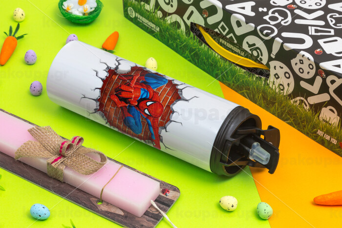 Spiderman wall, Πασχαλινή Λαμπάδα με Travel Tumbler θερμό με διπλό καπάκι (600ml, BPA free) & κερί αρωματικό πλακέ (30cm) (ΡΟΖ)