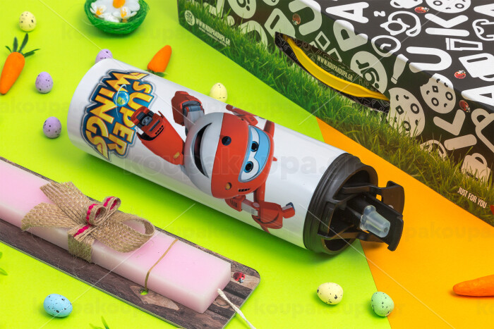 Super Wings, Πασχαλινή Λαμπάδα με Travel Tumbler θερμό με διπλό καπάκι (600ml, BPA free) & κερί αρωματικό πλακέ (30cm) (ΡΟΖ)