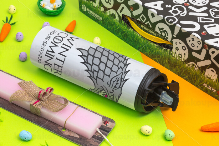 GOT House of Starks, winter coming, Πασχαλινή Λαμπάδα με Travel Tumbler θερμό με διπλό καπάκι (600ml, BPA free) & κερί αρωματικό πλακέ (30cm) (ΡΟΖ)