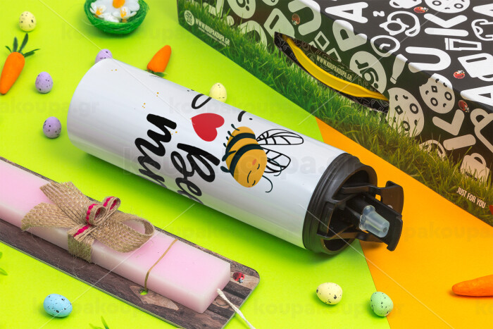 Bee mine!!!, Πασχαλινή Λαμπάδα με Travel Tumbler θερμό με διπλό καπάκι (600ml, BPA free) & κερί αρωματικό πλακέ (30cm) (ΡΟΖ)