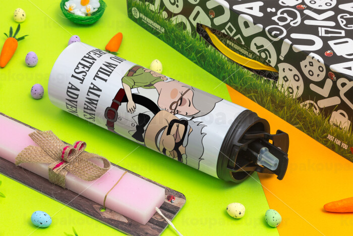 UP, YOU WILL ALWAYS BE MY GREATEST ADVENTURE, Πασχαλινή Λαμπάδα με Travel Tumbler θερμό με διπλό καπάκι (600ml, BPA free) & κερί αρωματικό πλακέ (30cm) (ΡΟΖ)