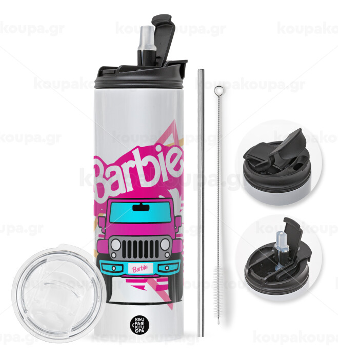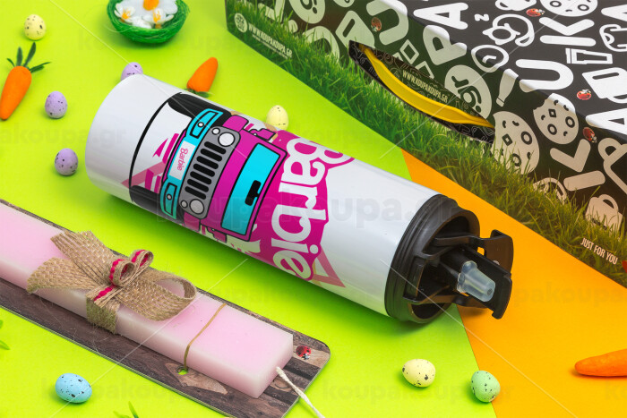 Barbie car, Πασχαλινή Λαμπάδα με Travel Tumbler θερμό με διπλό καπάκι (600ml, BPA free) & κερί αρωματικό πλακέ (30cm) (ΡΟΖ)