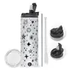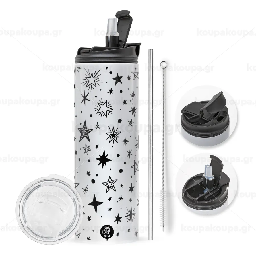 με 2 καπάκια για να επιλέξετε ανάμεσα σε απλό ποτήρι με καλαμάκι ή μετατροπή σε παγούρι θερμό με 2 τρόπους χρήσης (καλαμάκι ή στόμιο) με μεταλλικό επαναχρησιμοποιούμενο καλαμάκι. Απολαύστε το αγαπημένο σας ρόφημα κάθε στιγμή στο μοναδικό αυτό οικολογικό θερμό. Διατηρεί τη θερμοκρασία για αρκετές ώρες και είναι κατασκευασμένο από ανοξείδωτο ατσάλι. Κατάλληλο για ζεστά και κρύα ροφήματα. Συνοδεύεται από βουρτσάκι καθαρισμού για το καλαμάκι.