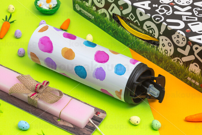 Watercolor dots, Πασχαλινή Λαμπάδα με Travel Tumbler θερμό με διπλό καπάκι (600ml, BPA free) & κερί αρωματικό πλακέ (30cm) (ΡΟΖ)
