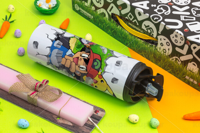 Pokemon brick, Πασχαλινή Λαμπάδα με Travel Tumbler θερμό με διπλό καπάκι (600ml, BPA free) & κερί αρωματικό πλακέ (30cm) (ΡΟΖ)