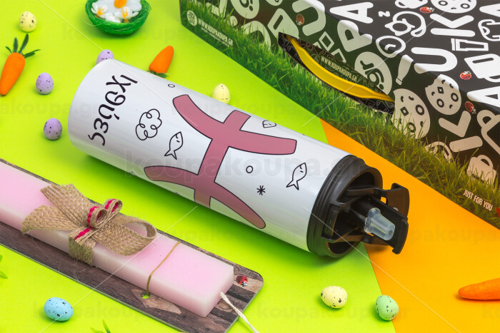 Ζώδια Ιχθύες, Πασχαλινή Λαμπάδα με Travel Tumbler θερμό με διπλό καπάκι (600ml, BPA free) & κερί αρωματικό πλακέ (30cm) (ΡΟΖ)