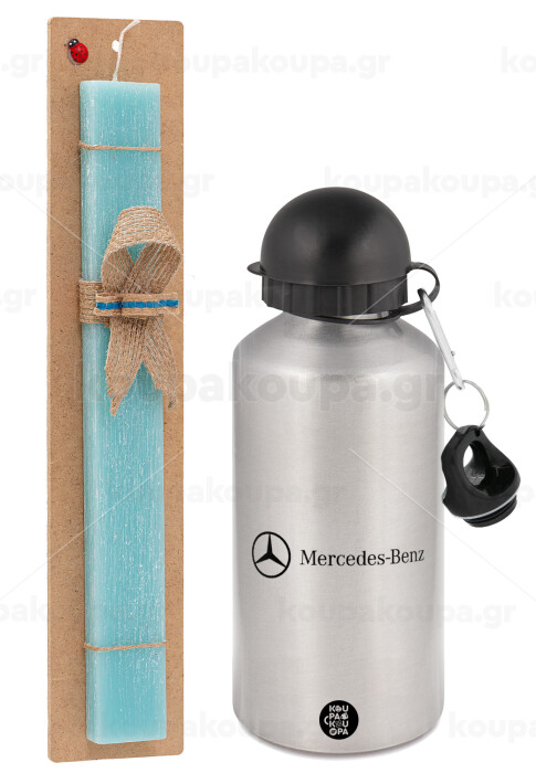 Mercedes small logo, Πασχαλινή Λαμπάδα με παγούρι μεταλλικό Ασημένιο αλουμινίου (500ml) & κερί αρωματικό πλακέ (30cm) (ΤΙΡΚΟΥΑΖ)