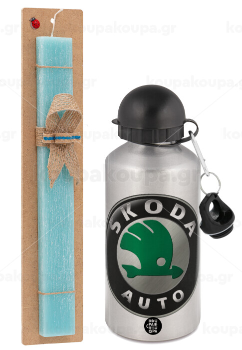 SKODA, Πασχαλινή Λαμπάδα με παγούρι μεταλλικό Ασημένιο αλουμινίου (500ml) & κερί αρωματικό πλακέ (30cm) (ΤΙΡΚΟΥΑΖ)