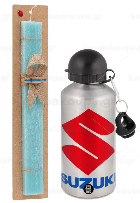 SUZUKI, Πασχαλινή Λαμπάδα με παγούρι μεταλλικό Ασημένιο αλουμινίου (500ml) & κερί αρωματικό πλακέ (30cm) (ΤΙΡΚΟΥΑΖ)