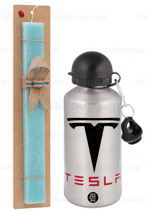 Tesla motors, Πασχαλινή Λαμπάδα με παγούρι μεταλλικό Ασημένιο αλουμινίου (500ml) & κερί αρωματικό πλακέ (30cm) (ΤΙΡΚΟΥΑΖ)