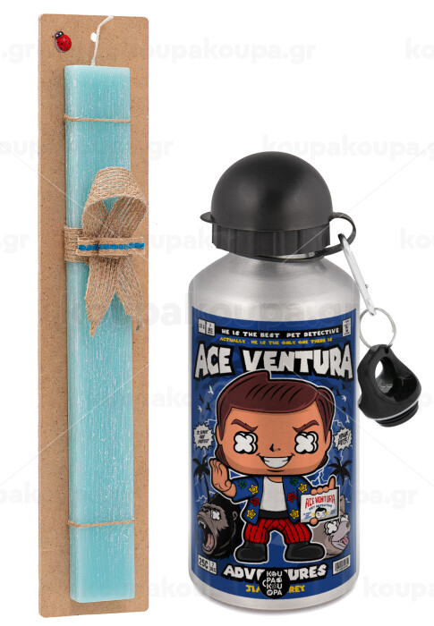 Ace Ventura: Pet Detective, Πασχαλινή Λαμπάδα με παγούρι μεταλλικό Ασημένιο αλουμινίου (500ml) & κερί αρωματικό πλακέ (30cm) (ΤΙΡΚΟΥΑΖ)