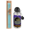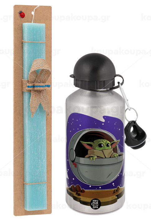 Baby Yoda mandalorian, Πασχαλινή Λαμπάδα με παγούρι μεταλλικό Ασημένιο αλουμινίου (500ml) & κερί αρωματικό πλακέ (30cm) (ΤΙΡΚΟΥΑΖ)