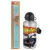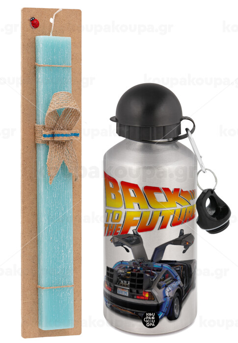 Back to the future, Πασχαλινή Λαμπάδα με παγούρι μεταλλικό Ασημένιο αλουμινίου (500ml) & κερί αρωματικό πλακέ (30cm) (ΤΙΡΚΟΥΑΖ)