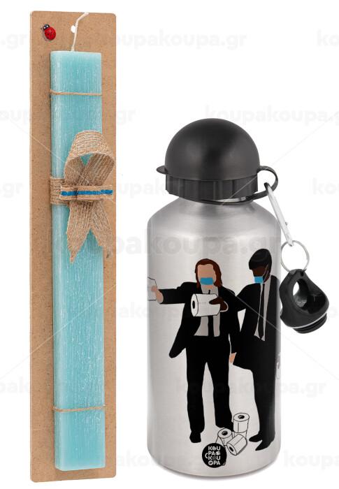Pulp Fiction 3 meter away, Πασχαλινή Λαμπάδα με παγούρι μεταλλικό Ασημένιο αλουμινίου (500ml) & κερί αρωματικό πλακέ (30cm) (ΤΙΡΚΟΥΑΖ)