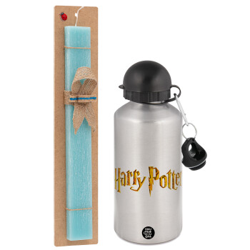 Harry potter movie, Πασχαλινή Λαμπάδα με παγούρι μεταλλικό Ασημένιο αλουμινίου (500ml) & κερί αρωματικό πλακέ (30cm) (ΤΙΡΚΟΥΑΖ)