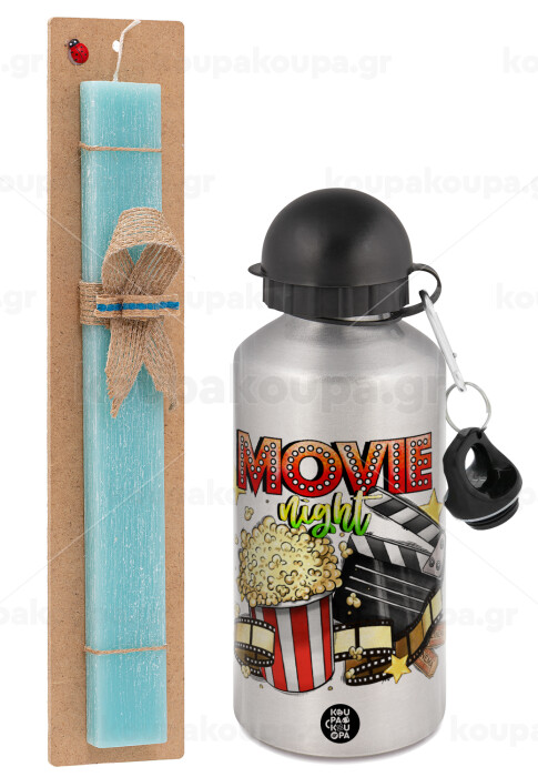 Movie night, Πασχαλινή Λαμπάδα με παγούρι μεταλλικό Ασημένιο αλουμινίου (500ml) & κερί αρωματικό πλακέ (30cm) (ΤΙΡΚΟΥΑΖ)