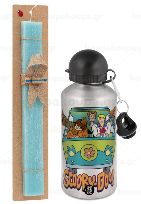 Scooby Doo car, Πασχαλινή Λαμπάδα με παγούρι μεταλλικό Ασημένιο αλουμινίου (500ml) & κερί αρωματικό πλακέ (30cm) (ΤΙΡΚΟΥΑΖ)