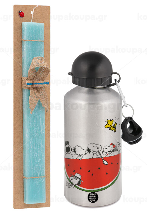 Snoopy summer, Πασχαλινή Λαμπάδα με παγούρι μεταλλικό Ασημένιο αλουμινίου (500ml) & κερί αρωματικό πλακέ (30cm) (ΤΙΡΚΟΥΑΖ)