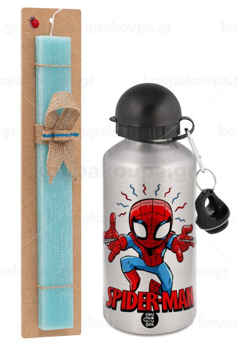 Spiderman flying, Πασχαλινή Λαμπάδα με παγούρι μεταλλικό Ασημένιο αλουμινίου (500ml) & κερί αρωματικό πλακέ (30cm) (ΤΙΡΚΟΥΑΖ)