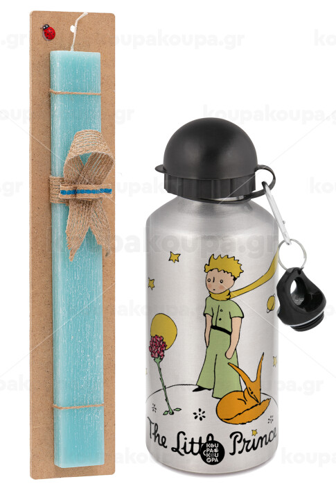 Ο μικρός πρίγκιπας classic, Πασχαλινή Λαμπάδα με παγούρι μεταλλικό Ασημένιο αλουμινίου (500ml) & κερί αρωματικό πλακέ (30cm) (ΤΙΡΚΟΥΑΖ)