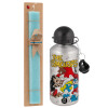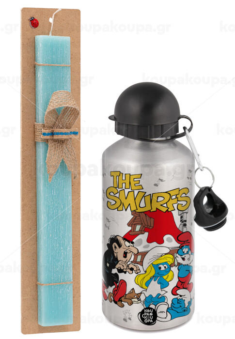 Τα στρουμφάκια, Πασχαλινή Λαμπάδα με παγούρι μεταλλικό Ασημένιο αλουμινίου (500ml) & κερί αρωματικό πλακέ (30cm) (ΤΙΡΚΟΥΑΖ)