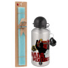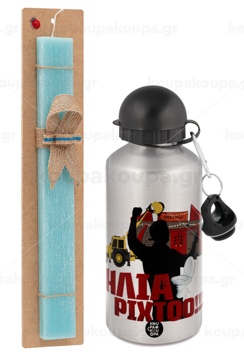 Ηλία ρίχτο!, Πασχαλινή Λαμπάδα με παγούρι μεταλλικό Ασημένιο αλουμινίου (500ml) & κερί αρωματικό πλακέ (30cm) (ΤΙΡΚΟΥΑΖ)