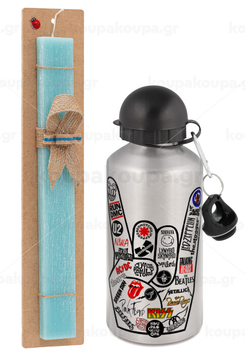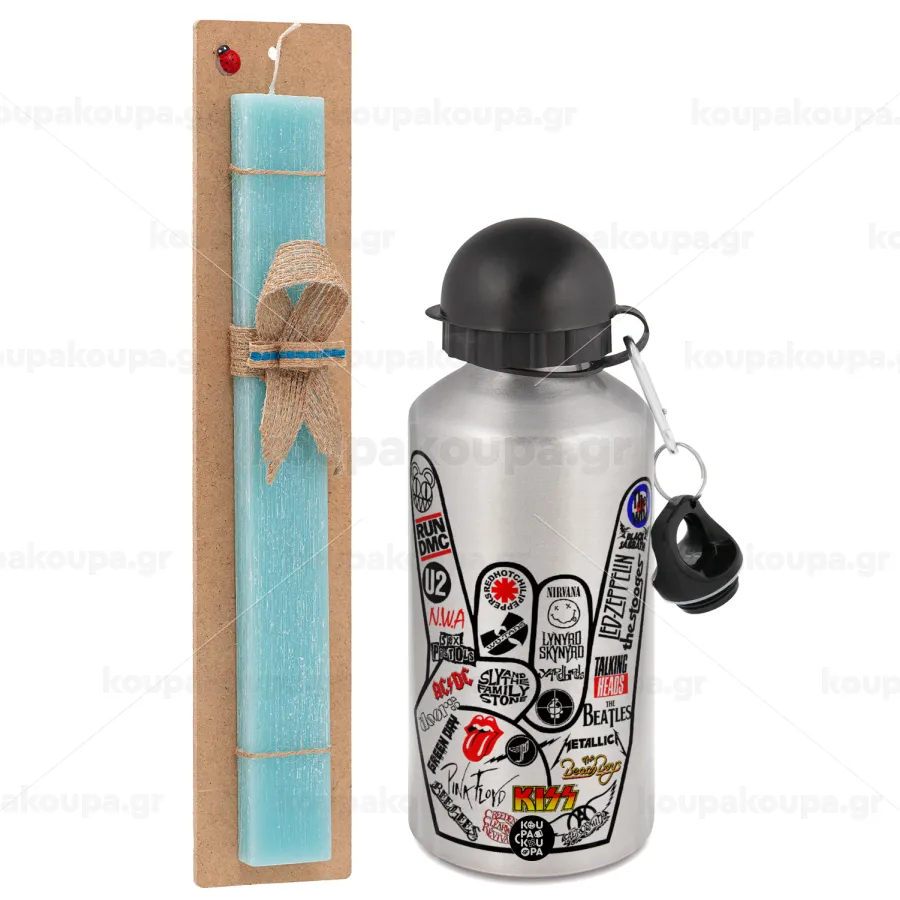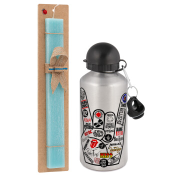 Best Rock Bands hand, Πασχαλινή Λαμπάδα με παγούρι μεταλλικό Ασημένιο αλουμινίου (500ml) & κερί αρωματικό πλακέ (30cm) (ΤΙΡΚΟΥΑΖ)