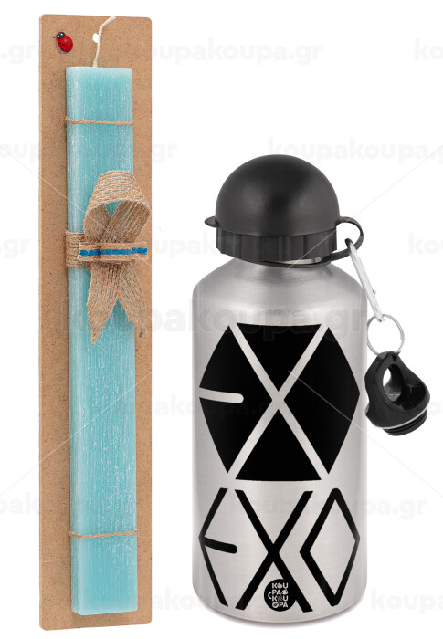 EXO Band korea, Πασχαλινή Λαμπάδα με παγούρι μεταλλικό Ασημένιο αλουμινίου (500ml) & κερί αρωματικό πλακέ (30cm) (ΤΙΡΚΟΥΑΖ)