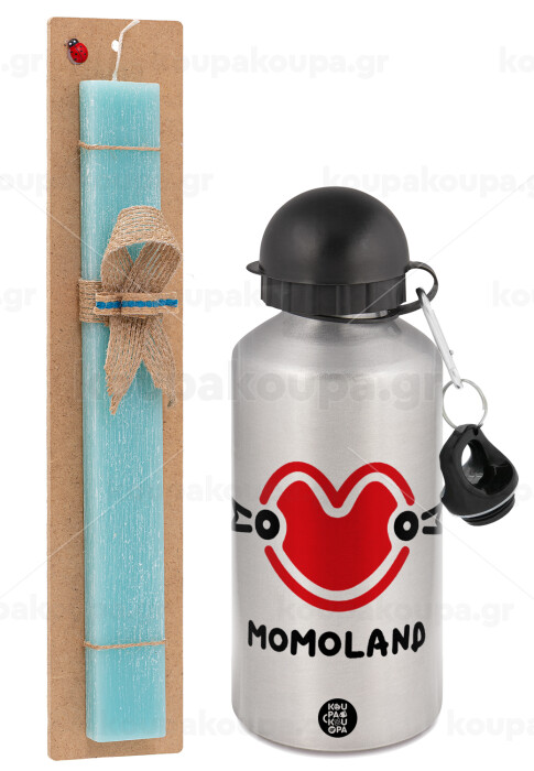 Momoland, Πασχαλινή Λαμπάδα με παγούρι μεταλλικό Ασημένιο αλουμινίου (500ml) & κερί αρωματικό πλακέ (30cm) (ΤΙΡΚΟΥΑΖ)