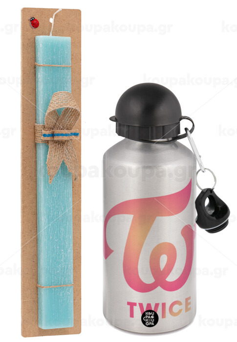 Twice, Πασχαλινή Λαμπάδα με παγούρι μεταλλικό Ασημένιο αλουμινίου (500ml) & κερί αρωματικό πλακέ (30cm) (ΤΙΡΚΟΥΑΖ)