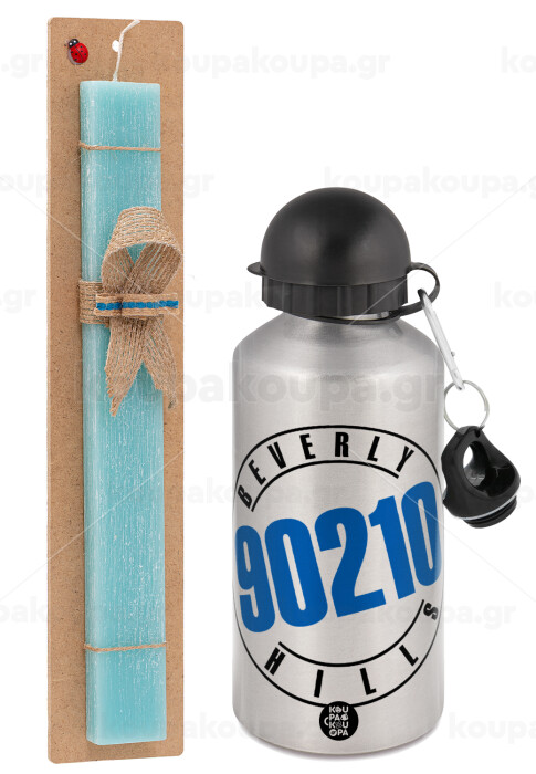 Beverly Hills, 90210, Πασχαλινή Λαμπάδα με παγούρι μεταλλικό Ασημένιο αλουμινίου (500ml) & κερί αρωματικό πλακέ (30cm) (ΤΙΡΚΟΥΑΖ)