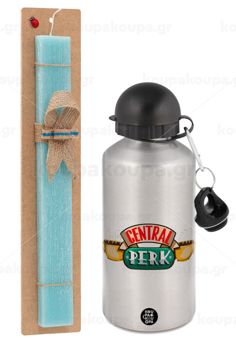 Central perk, Πασχαλινή Λαμπάδα με παγούρι μεταλλικό Ασημένιο αλουμινίου (500ml) & κερί αρωματικό πλακέ (30cm) (ΤΙΡΚΟΥΑΖ)