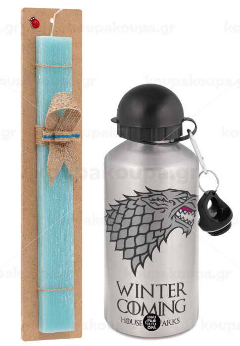 GOT House of Starks, winter coming, Πασχαλινή Λαμπάδα με παγούρι μεταλλικό Ασημένιο αλουμινίου (500ml) & κερί αρωματικό πλακέ (30cm) (ΤΙΡΚΟΥΑΖ)