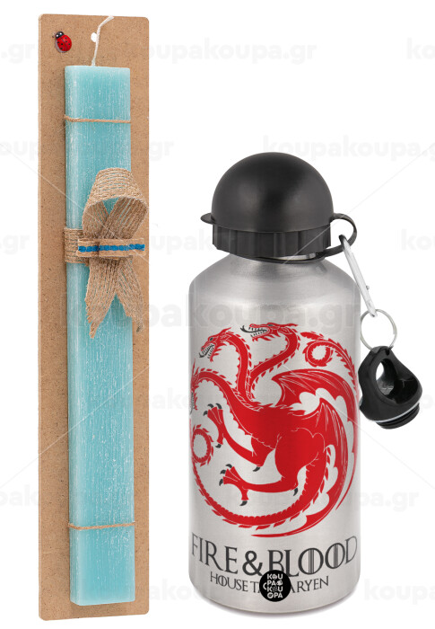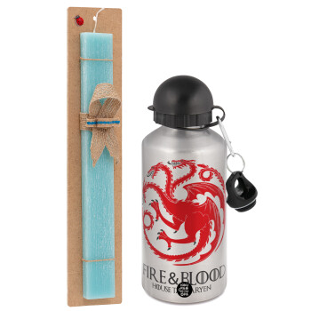 GOT House Targaryen, Fire Blood, Πασχαλινή Λαμπάδα με παγούρι μεταλλικό Ασημένιο αλουμινίου (500ml) & κερί αρωματικό πλακέ (30cm) (ΤΙΡΚΟΥΑΖ)