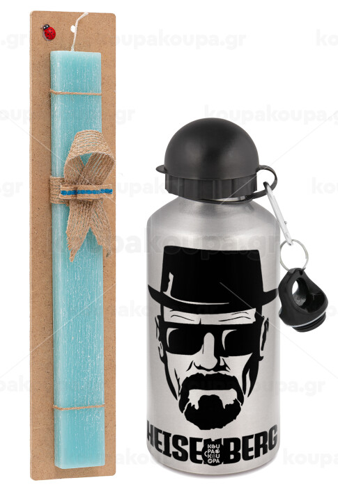 Heisenberg breaking bad, Πασχαλινή Λαμπάδα με παγούρι μεταλλικό Ασημένιο αλουμινίου (500ml) & κερί αρωματικό πλακέ (30cm) (ΤΙΡΚΟΥΑΖ)