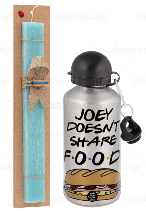 Joey Doesn't Share Food, Πασχαλινή Λαμπάδα με παγούρι μεταλλικό Ασημένιο αλουμινίου (500ml) & κερί αρωματικό πλακέ (30cm) (ΤΙΡΚΟΥΑΖ)