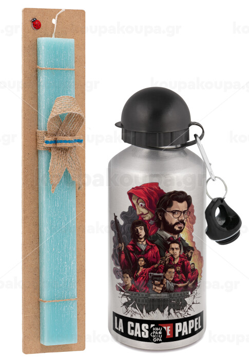 La casa de papel drawing cover, Πασχαλινή Λαμπάδα με παγούρι μεταλλικό Ασημένιο αλουμινίου (500ml) & κερί αρωματικό πλακέ (30cm) (ΤΙΡΚΟΥΑΖ)