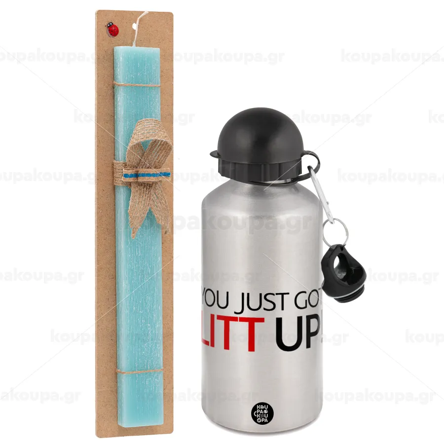 Suits You Just Got Litt Up! , Πασχαλινή Λαμπάδα με παγούρι μεταλλικό Ασημένιο αλουμινίου (500ml) & κερί αρωματικό πλακέ (30cm) (ΤΙΡΚΟΥΑΖ)