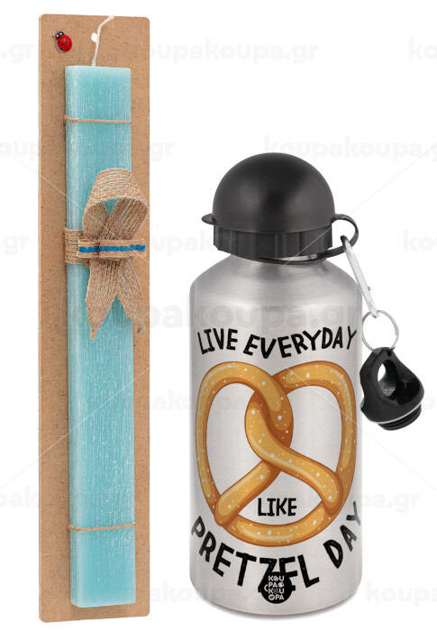 The office, Live every day like pretzel day, Πασχαλινή Λαμπάδα με παγούρι μεταλλικό Ασημένιο αλουμινίου (500ml) & κερί αρωματικό πλακέ (30cm) (ΤΙΡΚΟΥΑΖ)