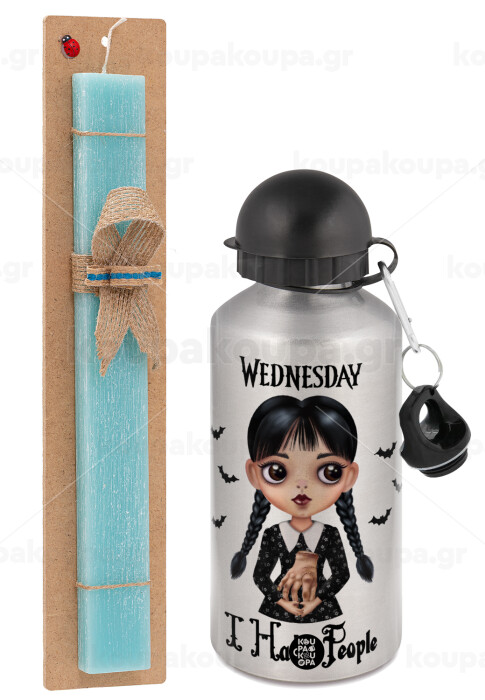 Wednesday Adams, i hate people, Πασχαλινή Λαμπάδα με παγούρι μεταλλικό Ασημένιο αλουμινίου (500ml) & κερί αρωματικό πλακέ (30cm) (ΤΙΡΚΟΥΑΖ)