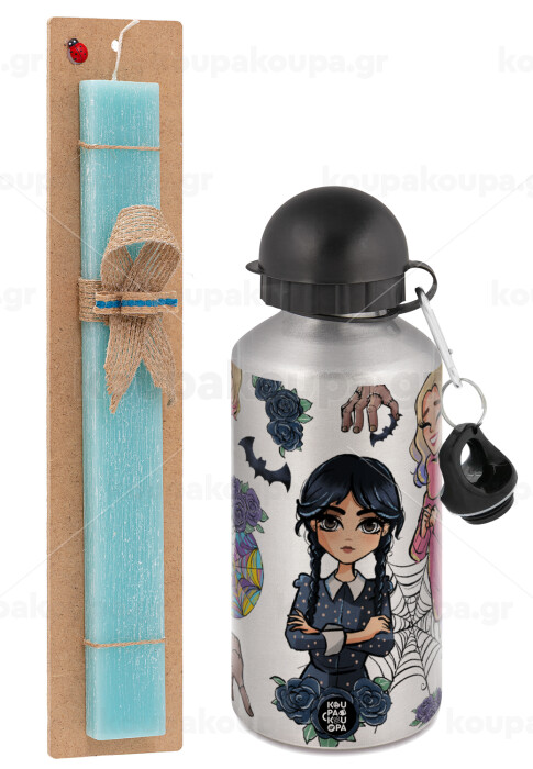 Wednesday and Enid Sinclair, Πασχαλινή Λαμπάδα με παγούρι μεταλλικό Ασημένιο αλουμινίου (500ml) & κερί αρωματικό πλακέ (30cm) (ΤΙΡΚΟΥΑΖ)