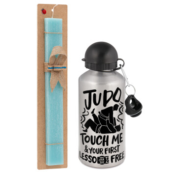Πασχαλινή Λαμπάδα με παγούρι μεταλλικό Ασημένιο αλουμινίου (500ml) & κερί αρωματικό πλακέ (30cm) (ΤΙΡΚΟΥΑΖ) με θέμα Αθλητικά