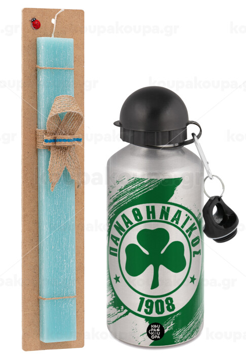 Π.Α.Ο., Πασχαλινή Λαμπάδα με παγούρι μεταλλικό Ασημένιο αλουμινίου (500ml) & κερί αρωματικό πλακέ (30cm) (ΤΙΡΚΟΥΑΖ)