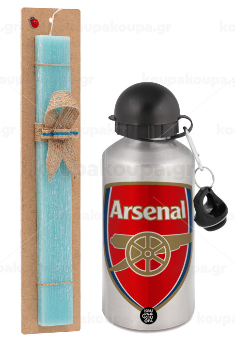 Arsenal, Πασχαλινή Λαμπάδα με παγούρι μεταλλικό Ασημένιο αλουμινίου (500ml) & κερί αρωματικό πλακέ (30cm) (ΤΙΡΚΟΥΑΖ)