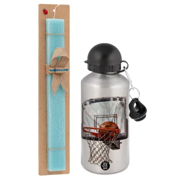Basketball, Πασχαλινή Λαμπάδα με παγούρι μεταλλικό Ασημένιο αλουμινίου (500ml) & κερί αρωματικό πλακέ (30cm) (ΤΙΡΚΟΥΑΖ)