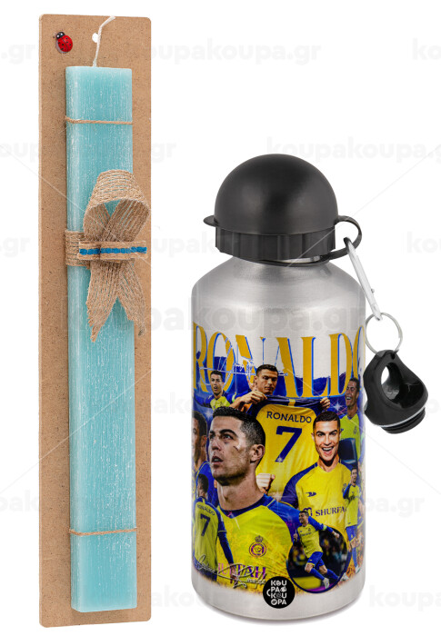 Cristiano Ronaldo Al Nassr, Πασχαλινή Λαμπάδα με παγούρι μεταλλικό Ασημένιο αλουμινίου (500ml) & κερί αρωματικό πλακέ (30cm) (ΤΙΡΚΟΥΑΖ)