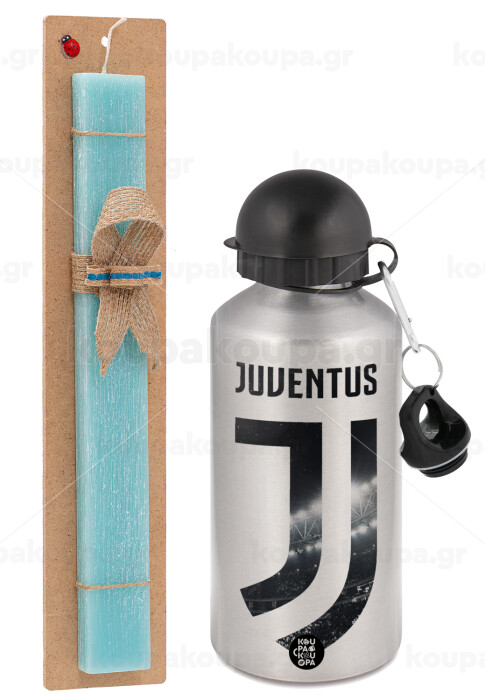FC Juventus, Πασχαλινή Λαμπάδα με παγούρι μεταλλικό Ασημένιο αλουμινίου (500ml) & κερί αρωματικό πλακέ (30cm) (ΤΙΡΚΟΥΑΖ)