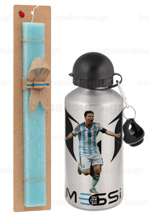 Λιονέλ Μέσι, Leo Messi, Πασχαλινή Λαμπάδα με παγούρι μεταλλικό Ασημένιο αλουμινίου (500ml) & κερί αρωματικό πλακέ (30cm) (ΤΙΡΚΟΥΑΖ)
