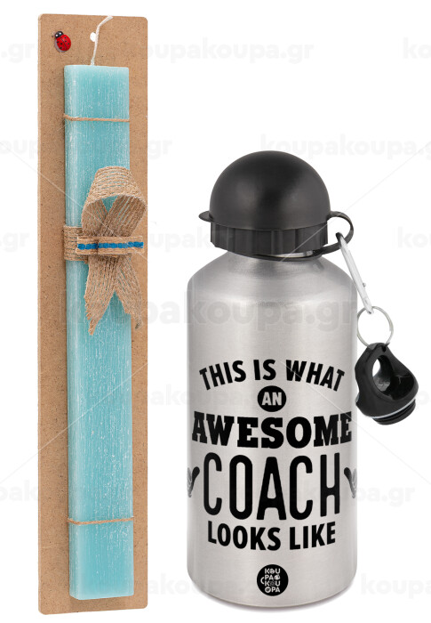 This is what an awesome COACH looks like!, Πασχαλινή Λαμπάδα με παγούρι μεταλλικό Ασημένιο αλουμινίου (500ml) & κερί αρωματικό πλακέ (30cm) (ΤΙΡΚΟΥΑΖ)
