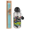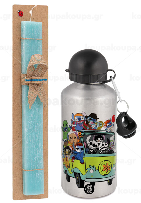 Stitch Halloween scooby car, Πασχαλινή Λαμπάδα με παγούρι μεταλλικό Ασημένιο αλουμινίου (500ml) & κερί αρωματικό πλακέ (30cm) (ΤΙΡΚΟΥΑΖ)